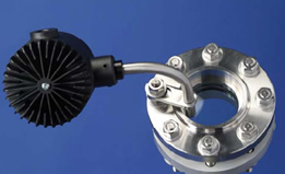 | Ein intensiver Lichtstrahl wird in einen Prozess- oder Druck- Behälter emittiert. Einmal im Tank, kann das Licht als 30°- Konus oder als 90°- Konus (nur Direktmontage) gestreut werden. |
